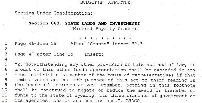 Barry tried to extort (a word he should know) votes from fellow legislators. He attempted an amendment mandating if you didn't vote for the budget and unconstitutional spending, your county would receive zero funding from the state. Extortion, bribery and 'logrolling' are all against the WY Constitution and WY Law. Here's the proof!